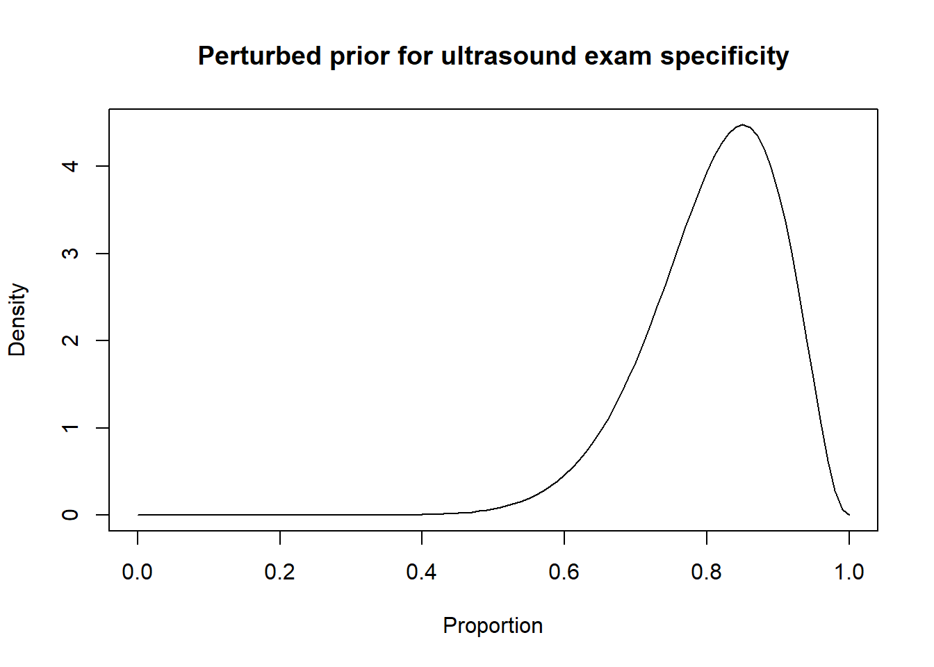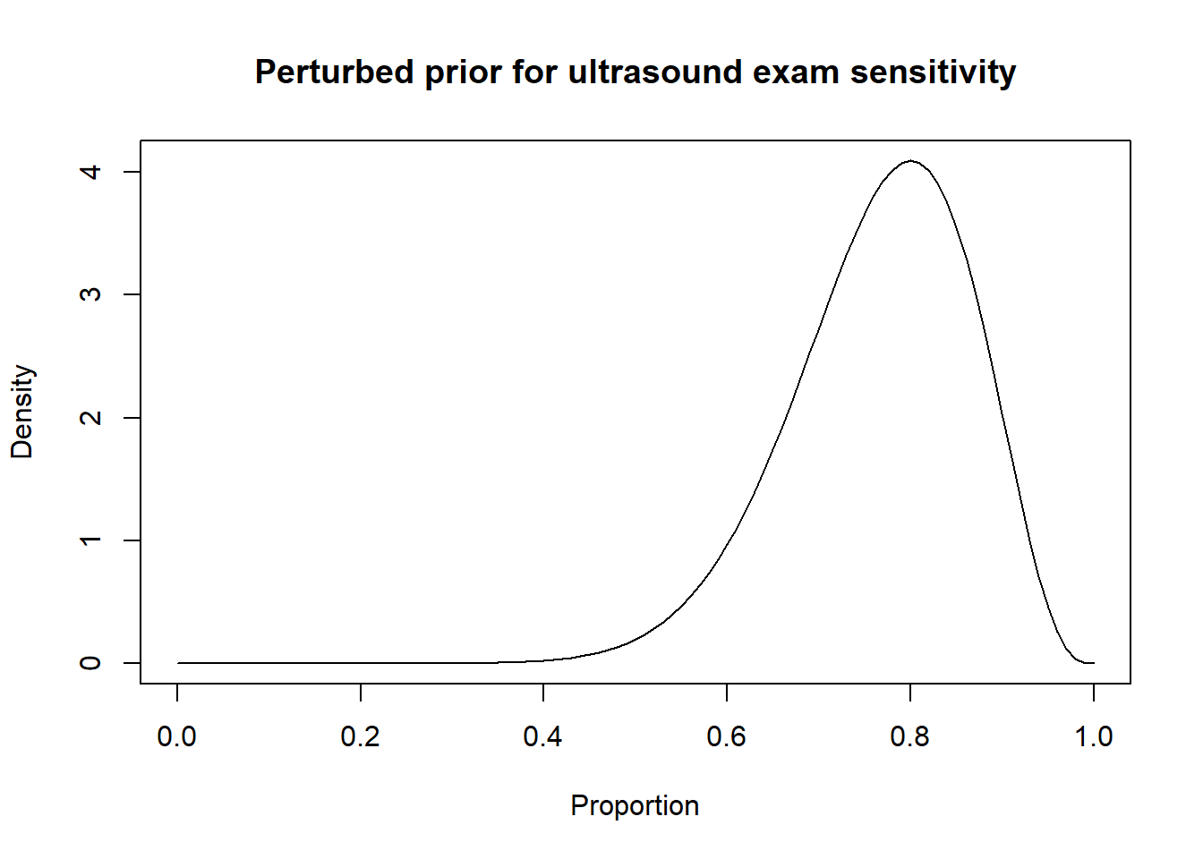 Thus, a possibility could be to move down the Se and Sp modes by 10 percentage points (i.e., mode for Se: 0.80 and mode for Sp: 0.85) and to increase the width of the distribution by moving the 2.5th percentiles by 30 percentage-points (Se 2.5th percentile: 0.55; Sp 2.5th percentile: 0.60). Thus: